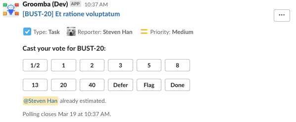 If your Jira backlog has unrefined issues, estimate polls for those issues will arrive as messages. Just click the buttons to vote. Defer means “let’s punt” or “let’s not estimate right now”. An issue is automatically deferred if no one votes on it. If an issue is deferred, it will be surveyed again sometime later. Flag means “flag this issue in Jira”. If an issue is flagged, it won’t come up again until someone removes the flag in Jira.